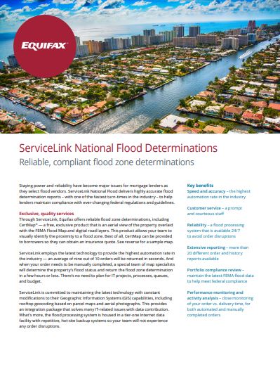 Staying power and reliability have become major issues for mortgage lenders as they select vendors, particularly a flood vendor who tracks their properties for flood status changes (life of loan flood zone determinations). Equifax has teamed with ServiceLink National Flood, the leading provider of flood zone determinations, to provide the reliability, accuracy and staying power that lenders need.
