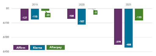 2021 was a breakout year for BNPL in the U.S. BNPL gross merchandise value accelerated to $49 billion, with projections to grow another 65% this year. But despite rapid growth, questions remain about profitability. According to the Financial Times, none of the three largest standalone BNPL firms are currently earning a profit. In fact, all three firms lost more money in 2021 than in previous years. Because many BNPL firms have been backed by venture capital, profit has been a secondary concern to market share thus far. But, as investors seek positive returns on their investments, profitability will matter more in the years ahead.
