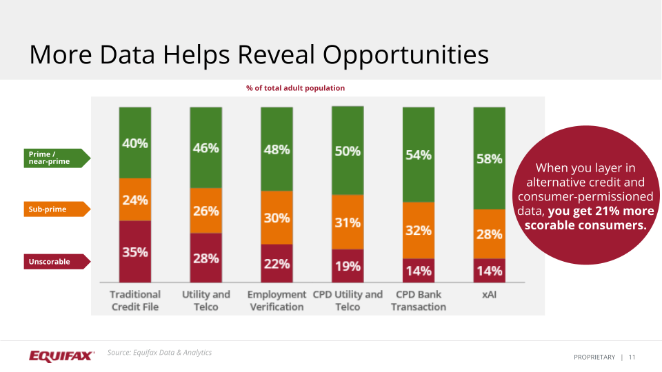 Also, they can confidently lend to those customers and give them the products that they deserve. Equifax (below) has lined up a variety of available data assets. Equifax demonstrated how layering the data assets can result in scoring additional consumers. The graph (below) shows that when you layer in alternative credit and consumer-permissioned data, you get 21% more scorable consumers.