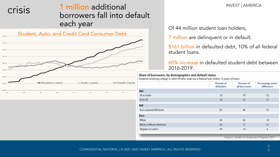 Unfortunately, due to the recent pandemic, many individuals have even more student loan debt than when the pandemic started (shown below). KB noted that Invest America focuses on delinquent and defaulted borrowers. Invest America is using data and research to understand the reality of these individuals. Millions of people fall into delinquency and default every year. Unfortunately, these people are unable to overcome this problem with the systems currently designed to lift them out of delinquency. These systems include the department of treasury, colleges and universities, credit bureaus, banks, and insurance companies.
