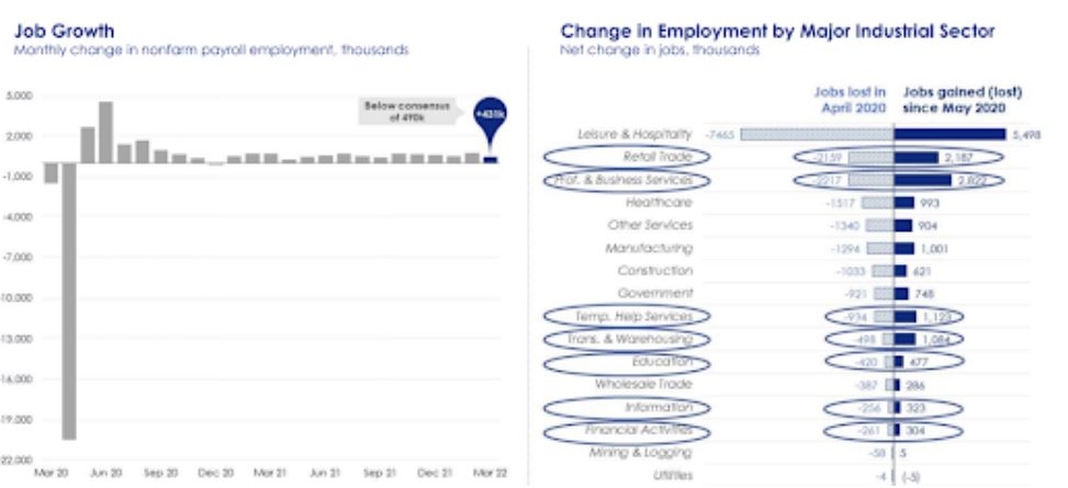 The U.S. labor market has officially recovered. As of recently, more sectors of the economy have recovered the jobs they lost in April 2020. The unemployment rate is down to 3.6%, which is back to its pre-pandemic level. Looking at the jobs that were lost in April 2021 on the left of Figure 2, we can conclude that 20 million jobs were lost that month, but a year later we have almost gained all the jobs back. We have not hit the number yet, but we are getting there rapidly, especially for 15 different occupational fields (shown on right of Figure 2). In December none of the occupational fields had retained their last job in that one month and now half the sectors have, concluding we are seeing a rapid healing of the labor market.