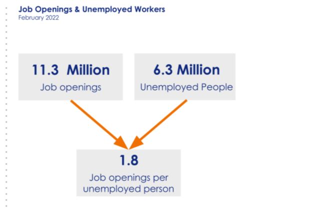 Labor markets are now in a rapid transition to the great resignation. With 11.3 million job openings, many of these workers are feeling empowered, making them more likely to want to quit their job. According to Figure 3, we have 11.3 million job openings and only 6.3 unemployed people.This is the highest ratio we have ever seen in 70 years. However, we are concerned about a few factors that can affect the supply chain, including COVID-19 developments, the Russia and Ukraine war, and inflation.