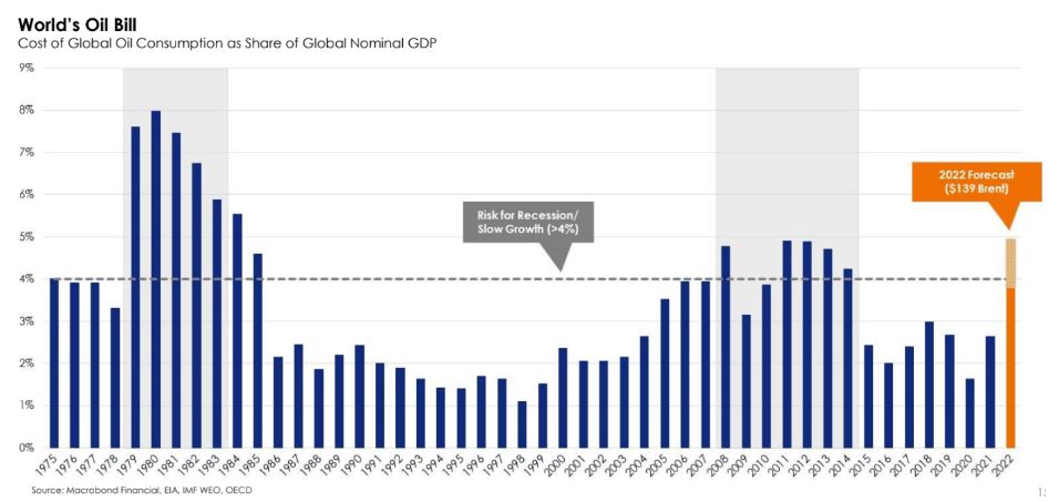 The World's Oil Bill is the value of all the oil in the world divided by global GDP. The World’s Oil Bill is a great way to assess how Russia is impacting the economy. From previous times when it tops 4%, the world GDP growth tends to slow down. Figure 5 shows what is happening right now.