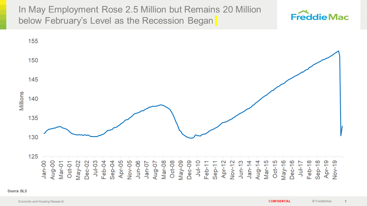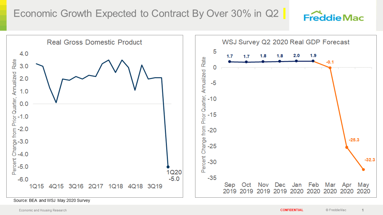 The economy shrunk by 5% in Q1, and it is expected to contract by over 30% in Q2, according to Sam Khater, Vice President, Chief Economist and head of Economic & Housing Research Department at Freddie Mac. He also noted the impact on the labor market, citing historically high unemployment rates as well as the recent data showing jobs are rebounding faster than expected. Employment is 20 million below where it was in February, but it is 2.5 million off the low reported back in early April.