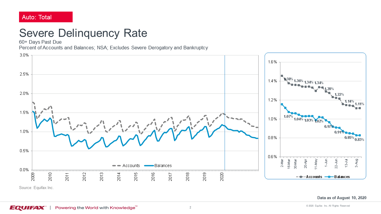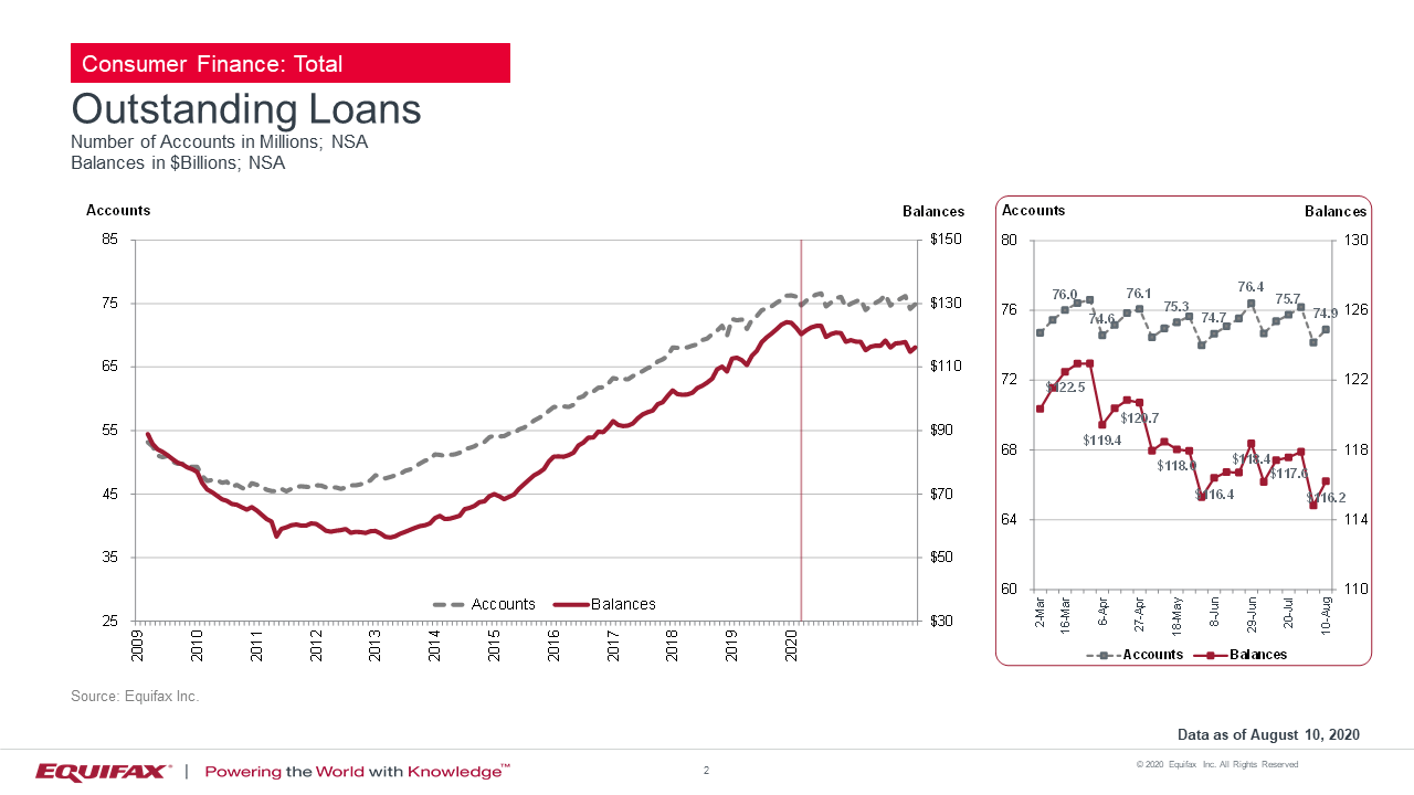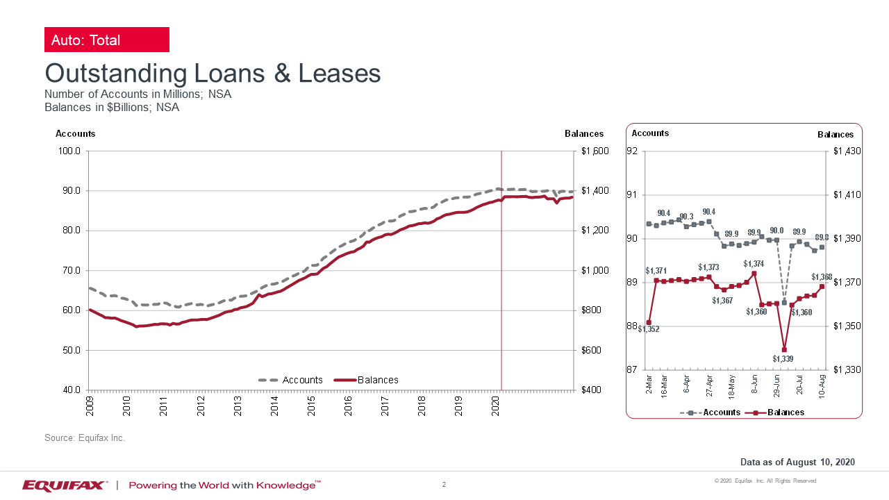 In addition to publishing key data and insights on the automotive industry from our recent webinar, Equifax also shares its U.S. National Consumer Credit Trends report on a weekly basis. The information shared below reflects data from the August 10, 2020 weekly report, published August 18, 2020.