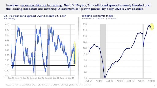 However, apprehensions are in overdrive. There are growing signs in the last quarter of 2022. We are either heading into a recession or, at the least, a “growth pause.” The U.S. Bond Yield Curve is nearly inverted per interest rate hikes, and the Index of Leading Economic Indicators has started to hook down, shown in Figure 1 below.