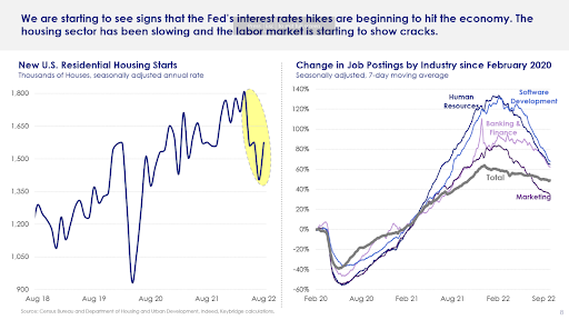 Reacting to the hikes, Westcott shared that the housing sector and labor market are showing cracks. New residential housing starts have dipped since April. We can expect housing to slow down even more in the next few months. Meanwhile, job postings have dipped, even for in-demand skillets like software developers, shown in Figure 3 below.