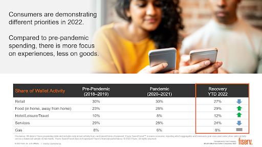 Consumers are demonstrating different priorities in 2022. Compared to pre-pandemic spending, there is more focus on experiences and less on goods, shown below in Figure 7.