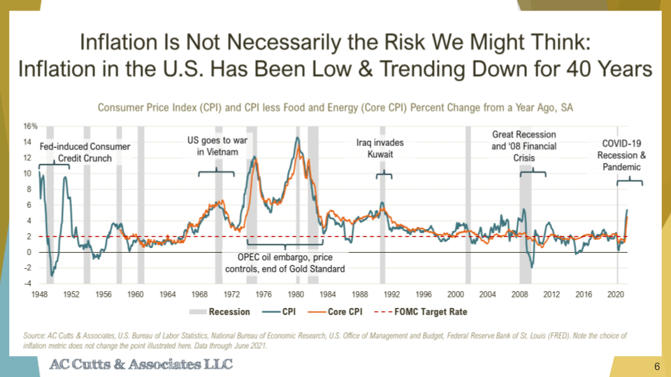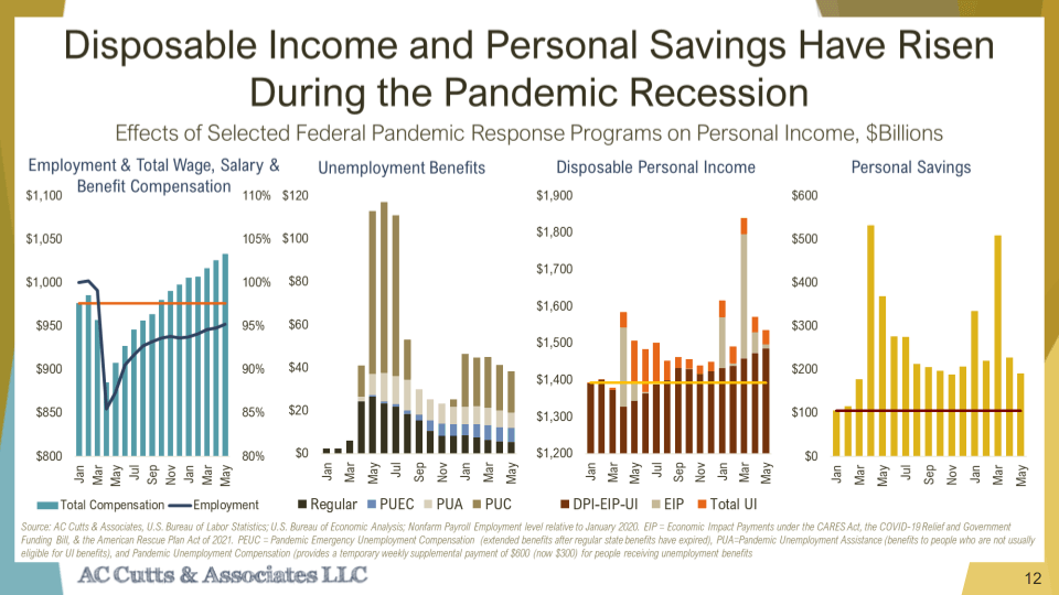 Amy Crews Cutts, President and Chief Economist at AC Cutts and Associates, started off the webinar with a recent U.S. economic update. According to Cutts, there was a 6.4% growth in the second quarter GDP. This number has brought us back to the pre-pandemic levels but not the pre-pandemic trends. However, even when we hit that trend, Cutts mentioned it is important to note that some coming out of this recession will never get back what they lost during the pandemic.