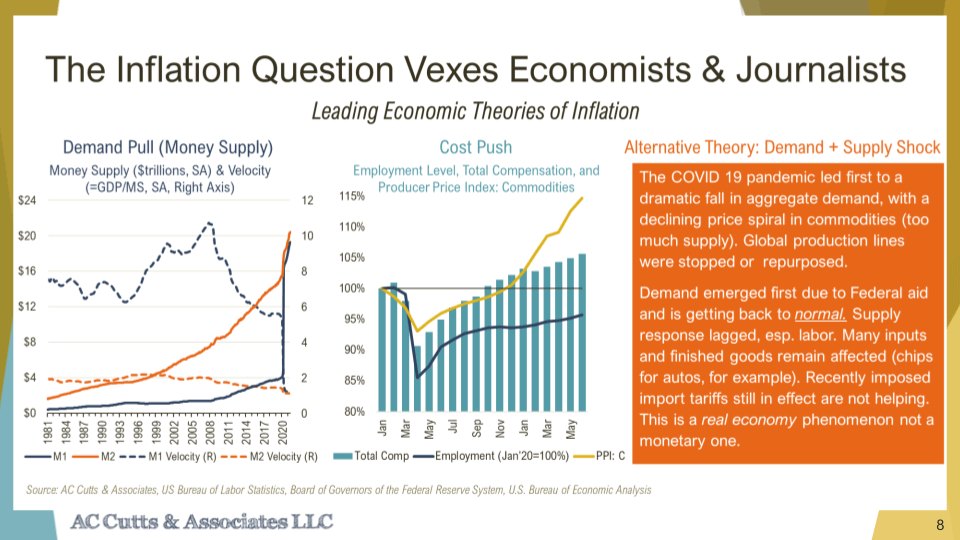 The cost push side states that wages are driving it up. That being said, the prices of goods and raw materials like lumber, are leading to that. The commodity side of the producer price index is rising sharply. However, most of the alternative theory, described below, is a temporary phenomenon. Cutts believes within a year that we'll be back to a more normal baseline.