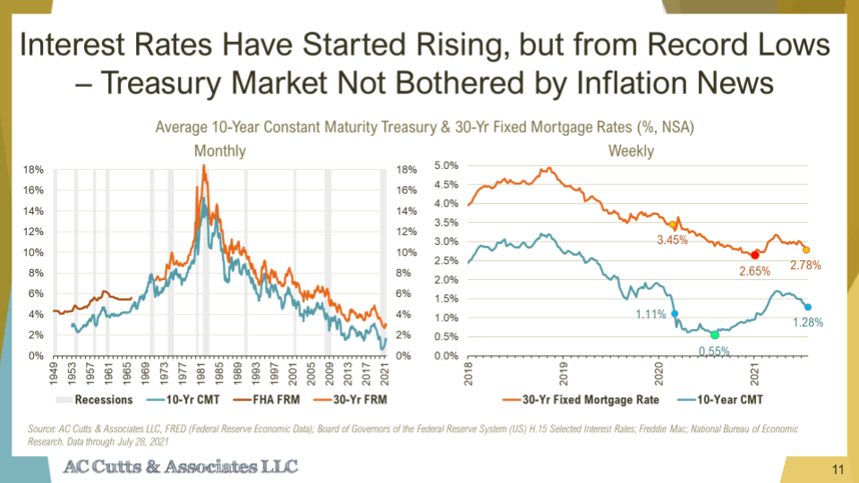 The CPI for all households has stayed in line. There was a dip during the early part of COVID, but it has come back to its baseline level of 3%. Rent, medical care, and all food and beverages have moderated considerably. This is another reason why Cutts believes we're largely seeing temporary impacts on inflation. Interest rates, treasury rates, mortgage rates, and auto rates have all come down. Interest rates are coming off of historic lows (shown right).