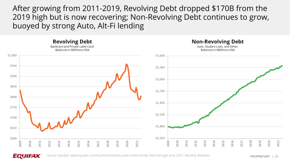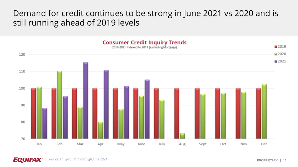 Next, Tom Aliff, Risk Consulting Leader at Equifax, further confirmed the pent-up demand theory. According to Aliff, we've seen that the request for new credit has risen substantially. The slide below shows an index month-by-month comparison for 2020 and 2021 indexed to 2019 (this is why the red bars, shown below, across every month are consistent at 100). There was a large drop off in the March and April timeframe. However, it had not returned to the 2019 levels until March of this year. We have been consistently above that throughout this time.