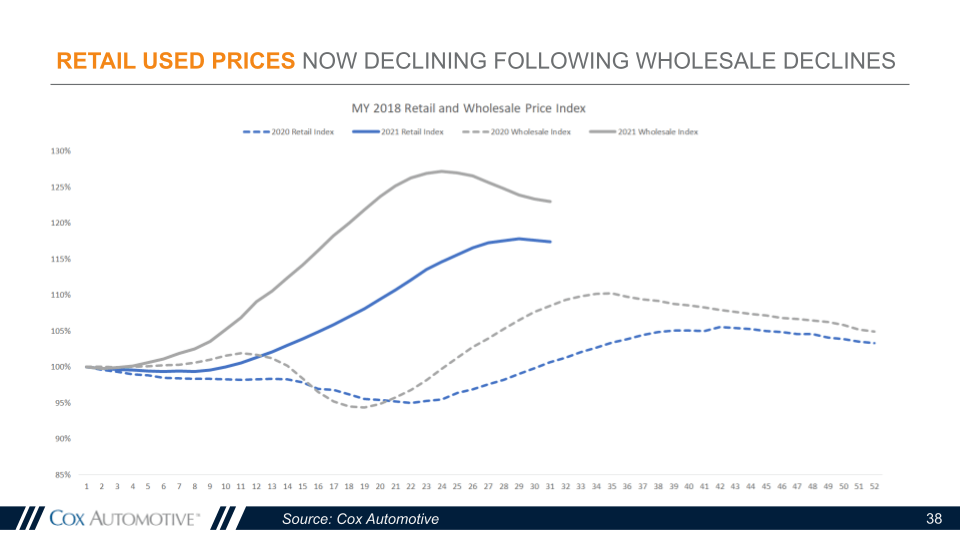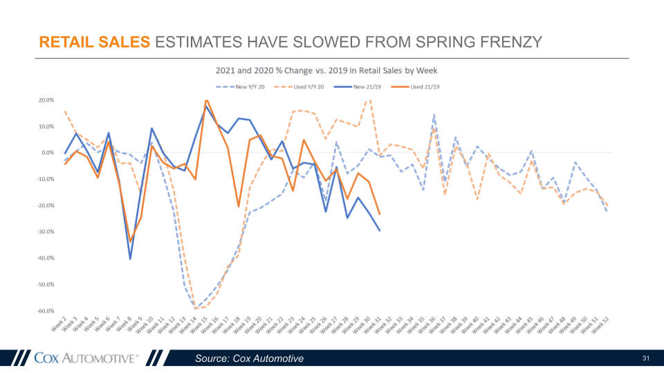 he final presenter, Jonathan Smoke, Chief Economist at Cox Automotive, continued Aliff’s conversation about retail sales and the spring activity. Smoke uses the Cox Automotive platform, Dealertrack®, to see what retail sales look like week-by-week. The estimates for those sales are compared to the same weeks in 2019 (shown below). The graphs below show that we had a “frenzy” around the end of March through the first half of May. At the highest point of that time period, Smoke presented that new and used retail sales were up 20% compared to what they were in the corresponding weeks in 2019. This is amazing especially since 2019 was the highest year in history for used retail sales until now.