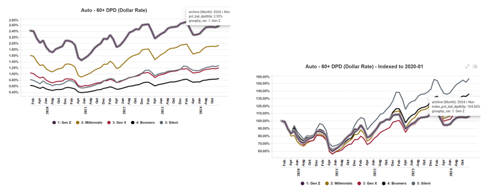 In the chart on the left, which shows consumers with auto loans having differing levels of 60+delinquency by generation, Gen Z has the highest 60+ auto loan delinquency (balance based).²