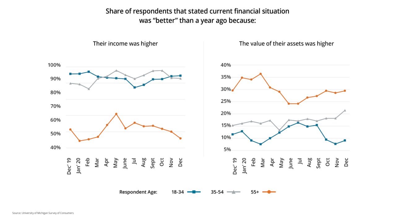 Among those who said their current financial situation was better than a year ago, younger respondents were more likely to cite rising income. Meanwhile, those aged 55 and up were more likely to cite rising asset values.