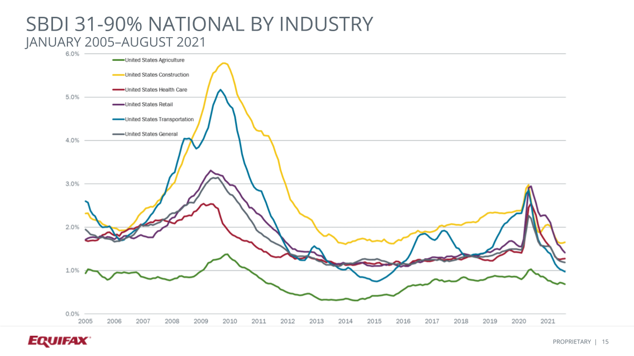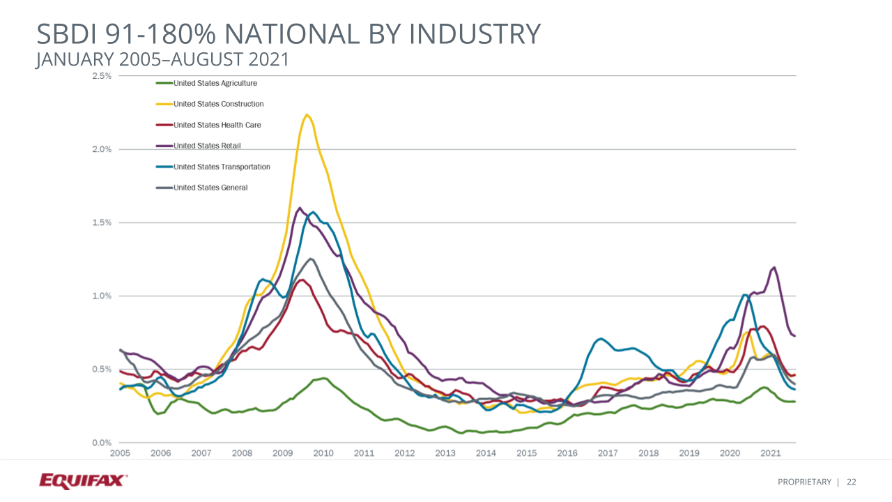 Briscoe followed with the overall U.S. Small Business Delinquency Index for 91-180 days past due. The chart below, shows that the delinquency rate decreased one basis point from July to August after plateauing for the majority of late 2020 and early 2021 period. Delinquency rates have come down and have decreased for the sixth consecutive month.