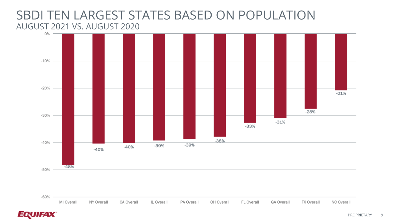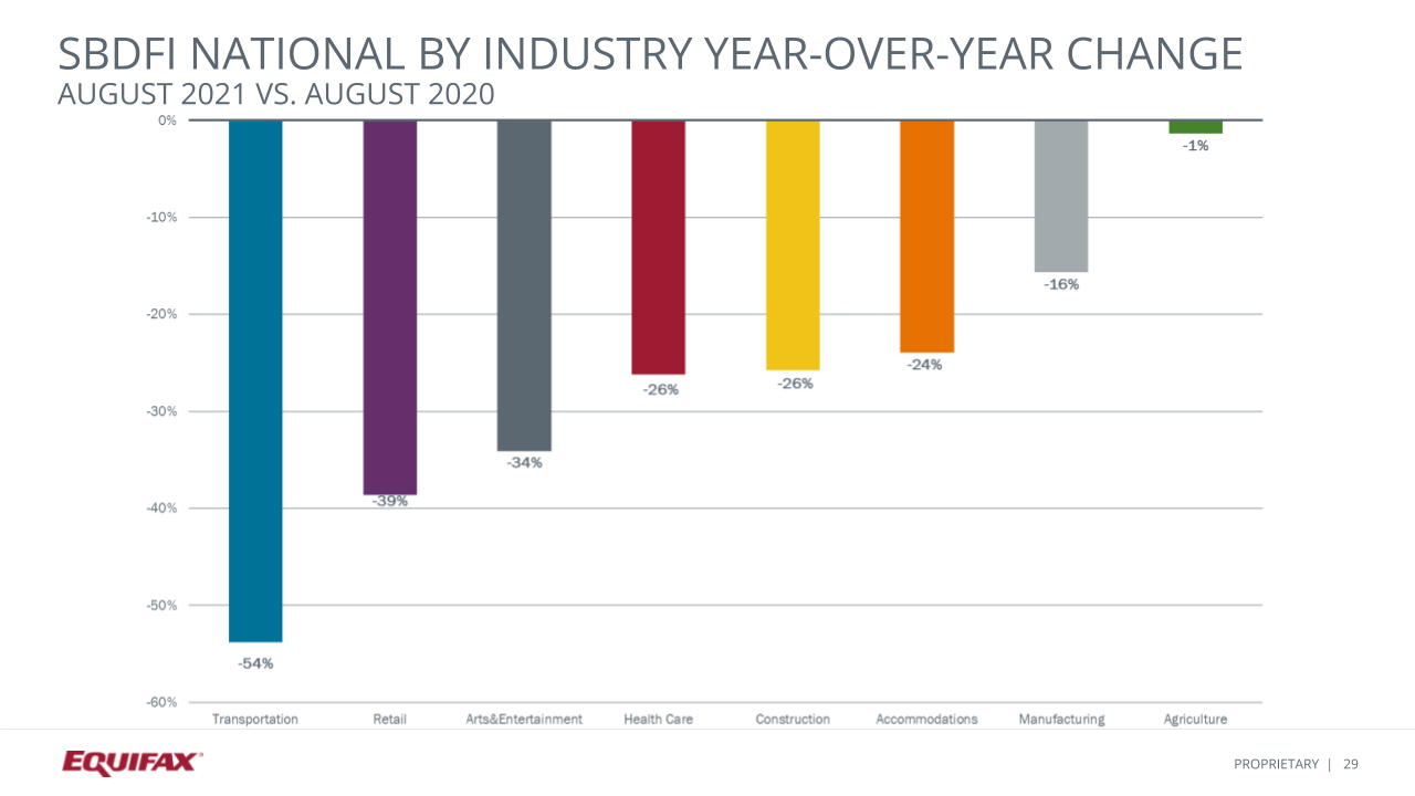 Next, Briscoe went over the Small Business Delinquency Index. The overall national Small Business Delinquency Index for the measure of 31-90 days past due decreased one basis point from 1.26% to 1.25% in August and has decreased every month but one since June 2020. Briscoe continued to report that the Index is at its lowest level since 2016.