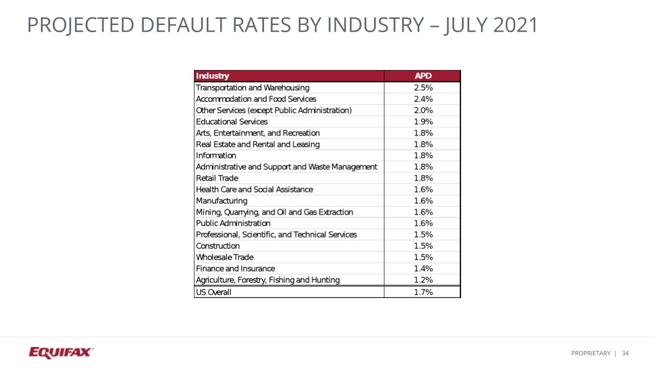 The projected default rates by county are more positive in the northern area. As we look forward, the southwest and southeast are showing higher risk. By industry, continued supply chain issues and trends lead to our highest projected defaults in Transportation and Warehousing and Accommodations and Services out of all the industries (shown below). However, overall default rates are projected to decrease as of last year.