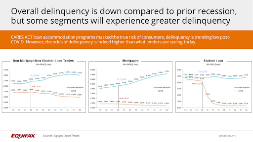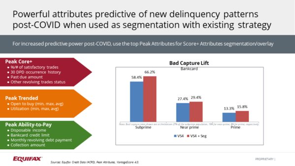 Lastly, Aliff called out the importance of using predictive attributes to segment populations. This makes it possible to identify new delinquency patterns post-COVID. Get more predictive insights by leveraging the Peak Core Plus, Peak Trended and Peak Ability-to-Pay from Equifax. This helps at both the underwriting and account management levels, as well as with portfolio expansion and direct marketing campaigns.