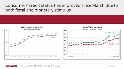 - Despite population economic differences, VantageScore had a nine-point overall increase for all consumers. The paydown of the debts, the balance and utilization reduction, as well as the lower delinquency levels were largely responsible for driving this.