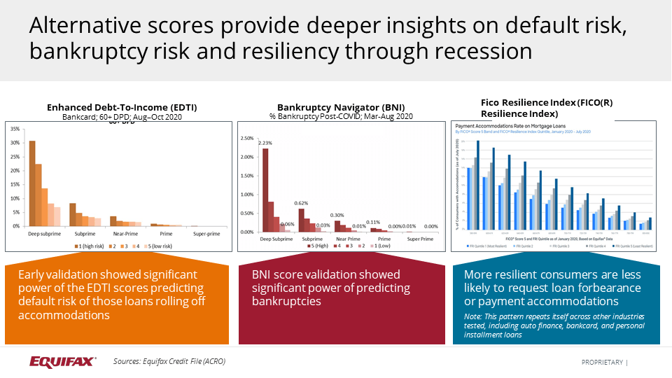 Companies should understand their accommodation population or if consumers are in accommodations at other lenders, said Aliff. Alternative scores can help provide more accurate insights into default risk, bankruptcy risk, as well as consumer financial resiliency through the recession. As shown below, Equifax has three such score models, including: