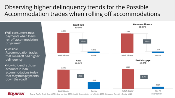 Aliff explained that it will be important to watch payment behavior and delinquency rates as benefits end and loans roll off of accommodations. It's also important to note accounts that went into accommodation status may have already been delinquent at that time and were fixed at the same delinquency rate until they rolled off. In the chart below you can see the initial numbers for accounts that have come out to possible accommodations (PA) are showing higher rates of delinquency than non-PA accounts. These numbers reflect credit card, consumer finance, auto and first mortgages lines of credit. As shown below, delinquency rates are up to 12.8 times higher for credit cards and up to 2.8 times higher for auto tradelines than those not in PA.