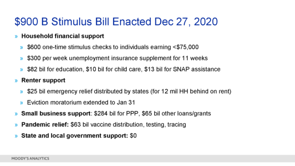 On December 27, 2020 Congress rolled out the additional stimulus bill, which included more than 5,000-pages. Moody’s Analytics summarized the most important financial aspects of the $900 billion plan. The key focus areas of the bill include: household financial support, renter support and small business support, according to deRitis. For those struggling financially, the added stimulus provides relief. Furthermore, it's instrumental in enabling the economy to move forward and reestablish the labor market.