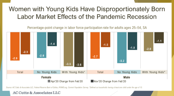 - Women with young children (under 13 years old) are hit disproportionately in the labor market compared to both other women without kids and males with and without young kids.