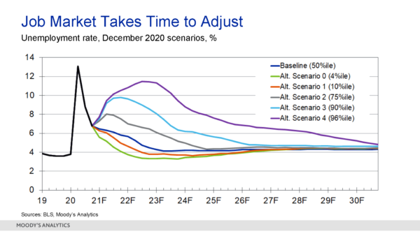 Furthermore, Moody’s Analytics created a simulation of the economy that constructed various outcomes at the tails of vaccine distribution. There are numerous possible outcomes with scenario zero being the best and four being the worst. Scenario zero would mean the vaccine distribution and stimulus packages are very effective and would enable unemployment to equalize the fastest. Scenario four shows the outcome if vaccinations see global resistance and if there are additional shocks from countries being unable to contain the pandemic. In this case, unemployment numbers would spike and take longer to equalize. Overall, deRitis added that the expectation is that things will get better over time for the labor market and the outlook is positive so far, but cautioned that a lot could go wrong in the short term.