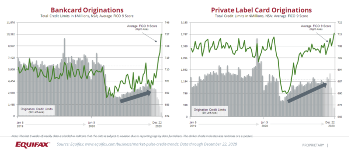- Private label card originations are back to early 2020 levels, while average credit scores have returned to pre-COVID levels.