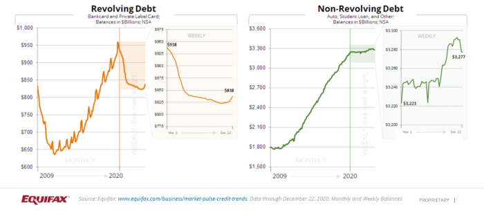 - Revolving debt has declined by $100 billion since March 2020; Non-revolving debt increased by $54 billion in the same period.