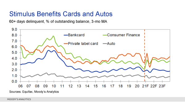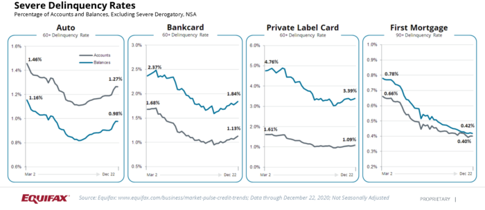 Delinquencies on auto, bankcard and private label card continue to increase, but are still below pre-pandemic levels; first mortgage delinquencies continue to decline.