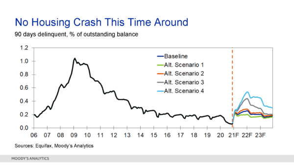 This will be more extreme for those who are struggling with unemployment. DeRitis expects the baseline return to be in line with pre-pandemic levels. As shown in the image below, delinquency levels can fluctuate between the best-case scenario one and the worst-case scenario four. But even in the worst-case scenario, delinquency levels “don't come anywhere near the level that we had during the last financial crisis," according to deRitis. Additional stimulus and pandemic resolution could help the delinquency levels from rising as well.