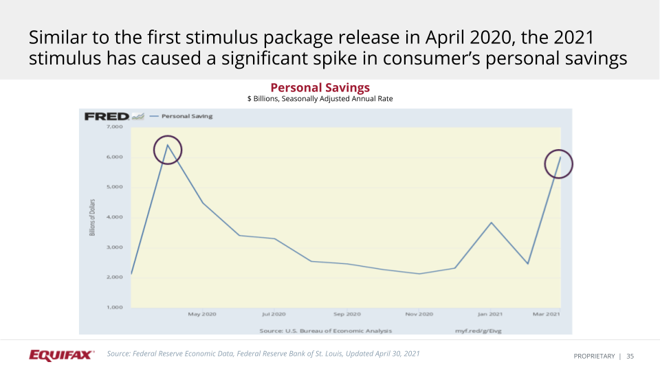 In the last part of the webinar, Tom Aliff, Senior Vice President of Data Analytics and a Consulting Leader at Equifax, went over the consumer credit trends. According to Aliff, the personal savings that have happened since the second stimulus package have started to pad consumer bank accounts again. Compared to last year, when we saw an uptick at the first circle (below), from a personal saving standpoint, we can compare it to the circle on the right, where we see an uptick due to the stimulus package. This sets up the nation starting to open up more around the Memorial Day holiday and consumers getting ready to spend their cash.
