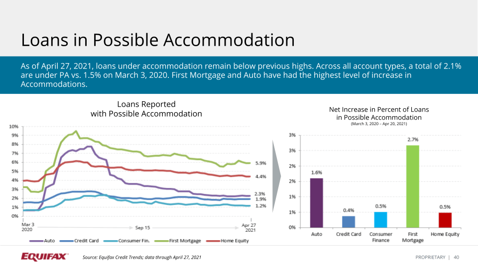When it comes to accommodation levels, first mortgage and equity are still slightly elevated (below). Aliff reported there was a slight drop off in auto and some reduction in the consumer finance perspective and credit card. Aliff concluded by mentioning the importance of actively monitoring and considering the first mortgage profiles. He also mentioned it is important when it comes to home equity, since that is often the consumer’s biggest payment every month.