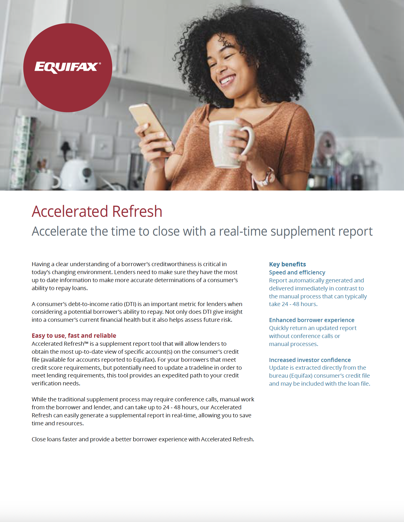 Accelerated Refresh™ is a supplement report tool that will allow lenders to obtain the most up-to-date view of specific account(s) on the consumer's credit file reported to Equifax.