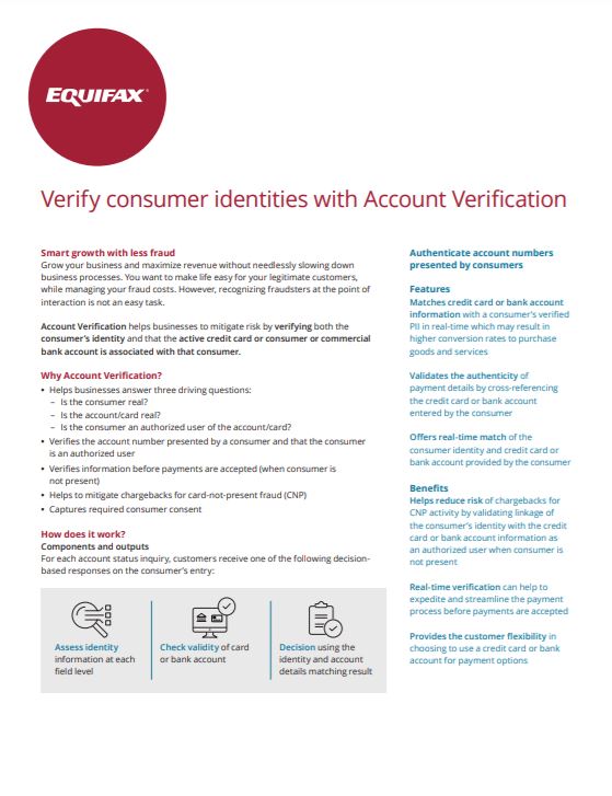 Account Verification helps businesses minimize risk by matching a consumer's bank account or credit card used for payment with their Personal Identifiable Information data. It verifies the identity of the consumer and that the valid form of payment is associated with that identity, which helps businesses recognize fraud at the point of interaction. This product can also confirm that commercial bank account details presented by a business are accurate and associated with that business.