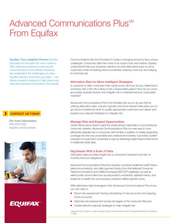 Advanced Communications Plus provides insight to help you better tailor customer onboarding, including your deposits, in order to help mitigate potential losses. It also gives you the capability to expand your business and acquire new customers in a growing population segment with little-to-no traditional credit.
