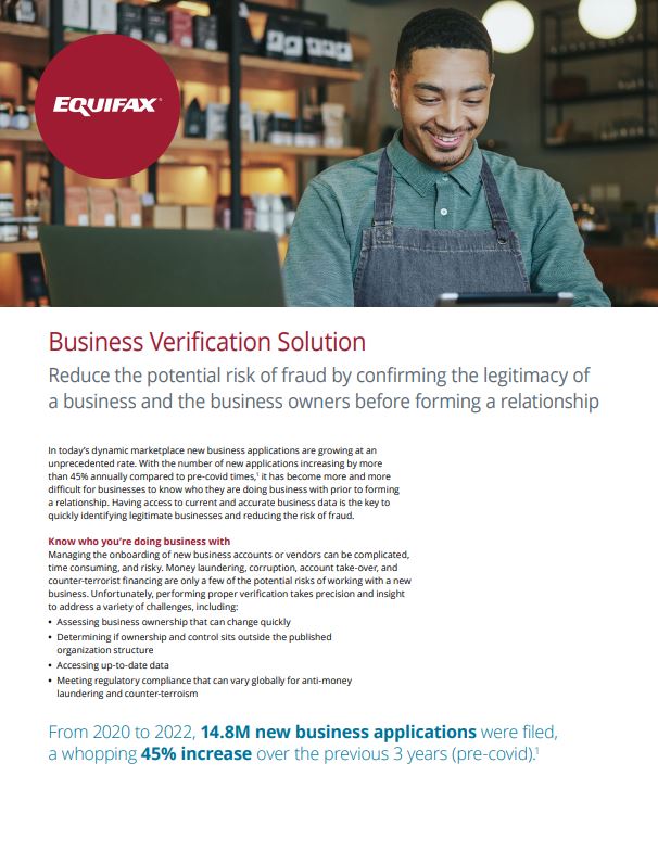 The Business Verification Solution is an online offering designed to help onboard new business accounts or vendors quickly. Through a rigorous validation process, Equifax will help confirm the business information provided matches verified data collected from a number of trusted sources, including: