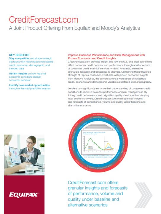 CreditForecast.com provides insight into how the U.S. and local economies affect consumer credit behavior and performance through a full spectrum of consumer credit analytics services – data, forecasts, alternative scenarios, research and full access to analysts. Combining the unmatched strength of Equifax consumer credit data with proven economic insights from Moody's Analytics, the service covers a wide range of household credit, economic and demographic variables at geography level.