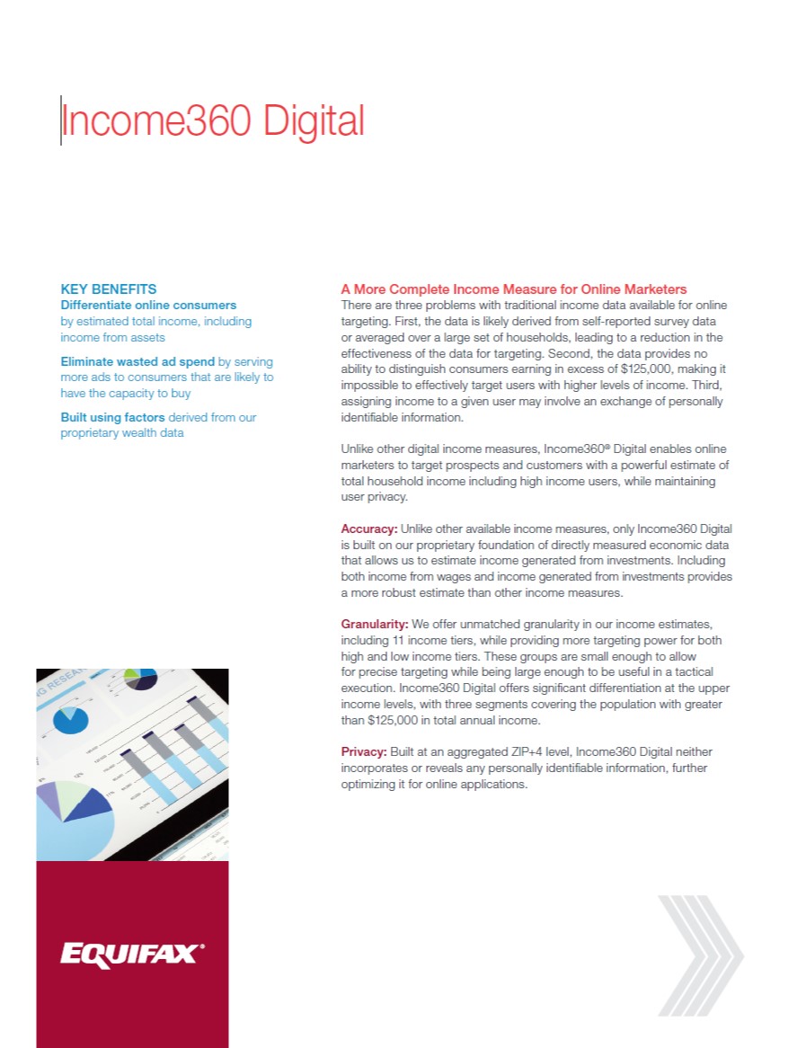 • Improve efficiency of online advertising budgets by refining target audiences based on their estimated financial profiles