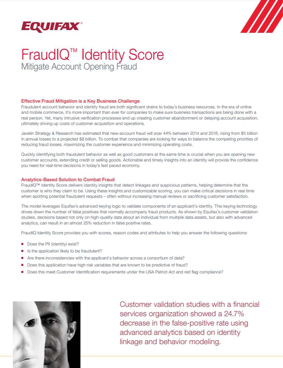 FraudIQ Identity Score leverages Equifax’s advanced keying logic to validate components of an applicant’s identity. This keying technology drives down the number of false positives that normally accompany fraud products. As shown by Equifax’s customer validation studies, decisions based not only on high-quality data about an individual from multiple data assets, but also with advanced analytics, can result in an almost 25% reduction in false positive rates.