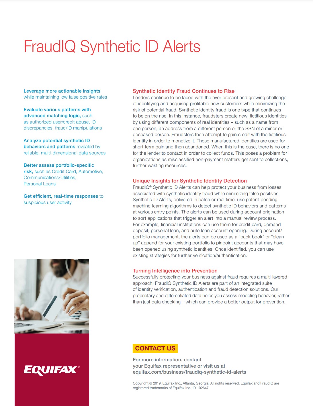 FraudIQ® Synthetic ID Alerts – part of our FraudIQ integrated suite of identity verification, authentication, and fraud detection solutions – can help protect your business from losses associated with synthetic identity fraud. Delivered in batch or real-time, the alerts use patent-pending machine-learning algorithms to detect synthetic identity behaviors and patterns at various entry points.