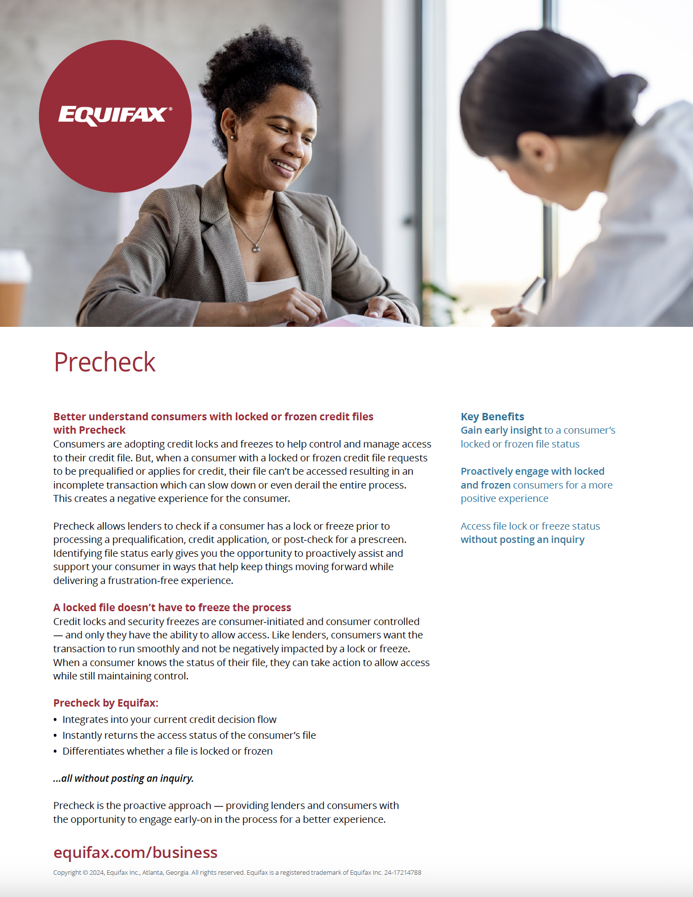 Consumers are adopting credit locks and freezes to help control and manage access to their credit file. But, when a consumer with a locked or frozen credit file requests to be prequalified or applies for credit, their file can't be accessed resulting in an incomplete transaction which can slow down or even derail the entire process. This creates a negative experience for the consumer. Precheck is the proactive approach — providing lenders and consumers with the opportunity to engage early-on in the process for a better experience.