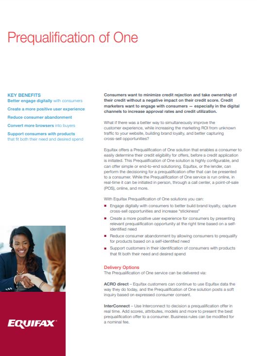 Prequalification of One™ enables a consumer to easily check their credit eligibility for offers before a credit application is initiated, which can help minimize credit rejection and avoid a negative impact on their credit score.