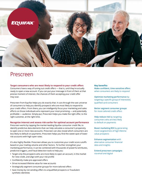 Prescreen delivers pre-approved consumer prospects tailored to meet the credit profile criteria for your lending offers. Increase acquisition by honing in on consumers with the right credit characteristics for your offers, while mitigating risk. Prescreen helps you create the ideal target audience by leveraging thousands of credit attributes, including event and behavior-based triggers, and your own credit-based attributes. Prescreen is a consumer report and its use is regulated by the Fair Credit Reporting Act (FCRA).