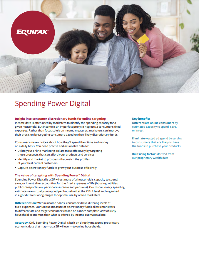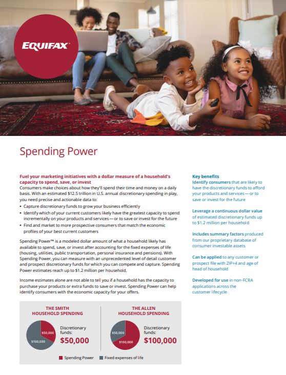 Unlike other behavioral-based indicators, Spending Power is derived from measured data and provides a high upper limit actual dollar value ($1.2 MM per household). Gain additional insight on the right consumers for your products and services.