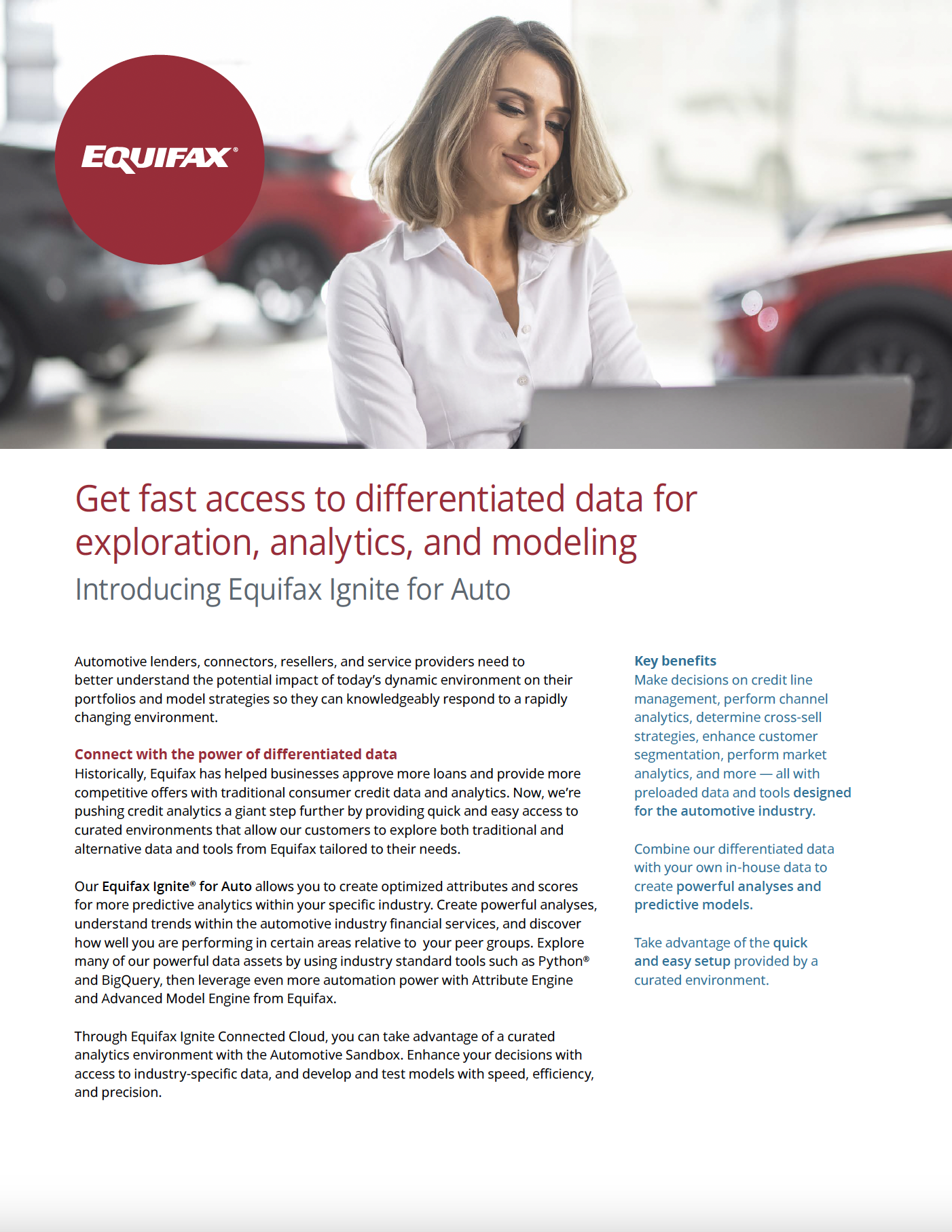 Equifax Ignite® for Auto offers fast access to differentiated industry-specific data for exploration, analytics and modeling. Now companies can create powerful analyses, understand trends within the automotive industry, and benchmark performance against peer groups.