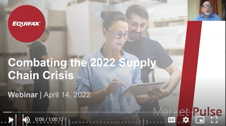 Watch our webinar, moderated by Jeff Jones, Master Vertical Consultant-Logistics at Equifax, on the recent supply chain challenges the economy is facing in multiple industries around the world and the products Equifax can provide to help, including our new Equifax Supplier Risk Solution. Robert Wescott, President at Keybridge will provide a macro-economic update on different markets including the oil and metal markets, followed by Tom Aliff, Risk Consulting Leader & Sarah Briscoe, Lead Commercial Statistical Analyst at Equifax, who will provide consumer credit and small business trends. Then we will close out our webinar with a discussion with special guest Daniel Pickett, Chief Data & Technology Officer at Freight Waves on the supply chain issue our economy is facing today and how it may be affecting you by Freight Waves sharing their recent supply chain risk analysis.